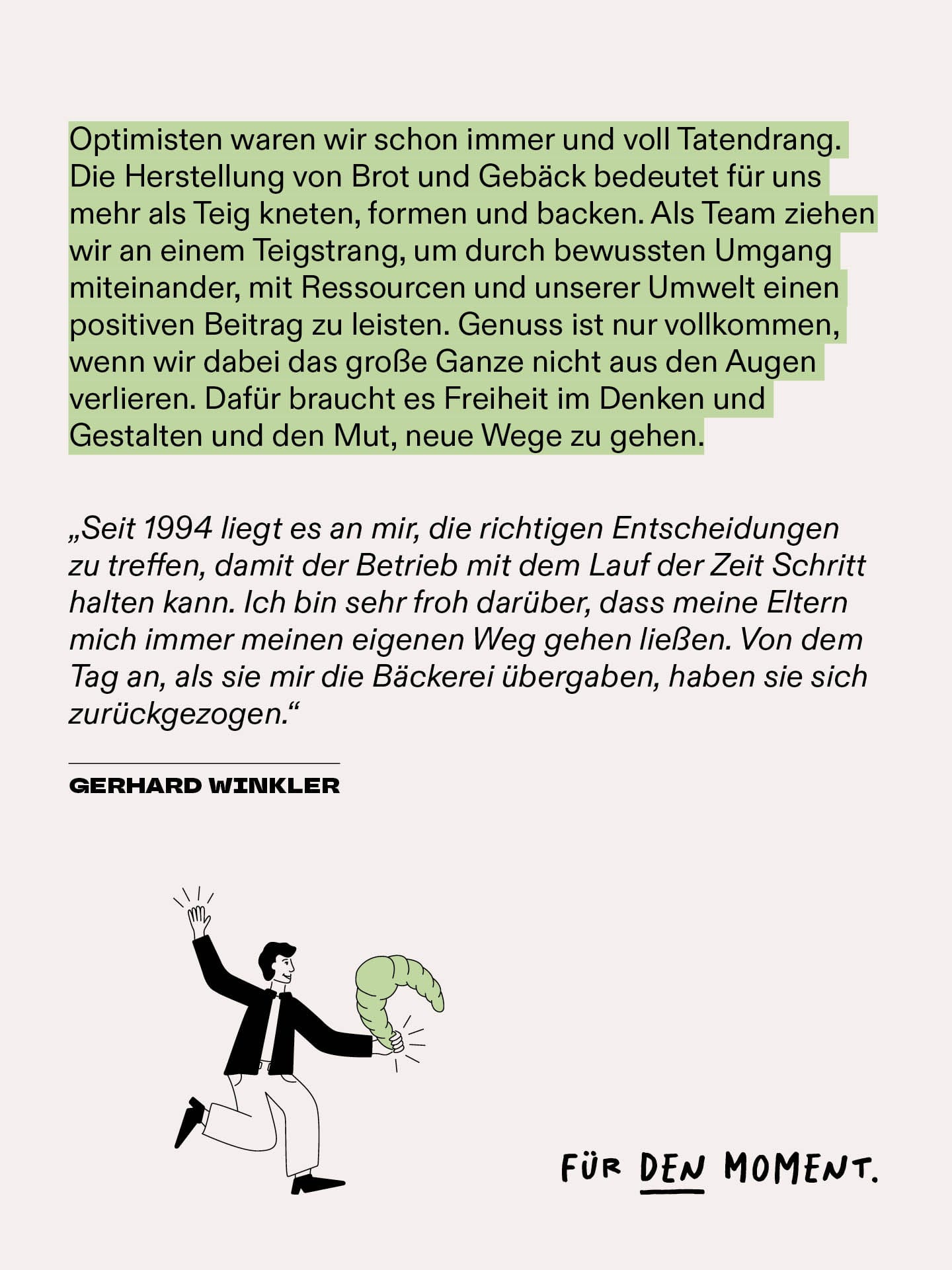 Die Bäckerei WINKLER macht Brot, das mehr kann, als satt machen – es begleitet Menschen in kleinen und großen Momenten. Mit jahrhundertealter Handwerkstradition, Leidenschaft und Verantwortung für Mensch und Natur entsteht ein Genuss, der nicht nur gut schmeckt, sondern sich echt authentisch anfühlt. Brot für den Moment ist dabei mehr als ein Slogan – es ist eine Haltung, die Genuss und Lebensfreude zusammenbringt.